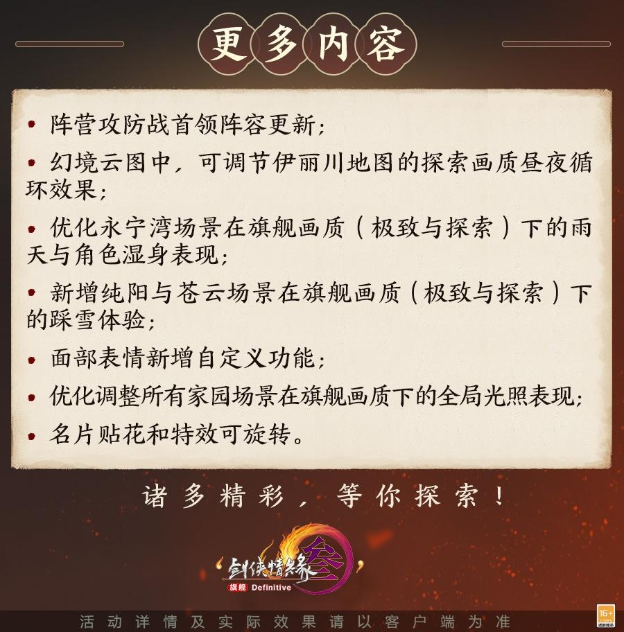 除此之外,还有诸多内容等待侠士探索!或是策马扬鞭,赓续热血,体验阵营攻防战首领阵容更新!或是江湖揽胜,行遍千山,或在永宁湾感受雨中闽南风情,或前往纯阳与苍云,体验踩雪的乐趣!万般风景,与侠士相会今朝!