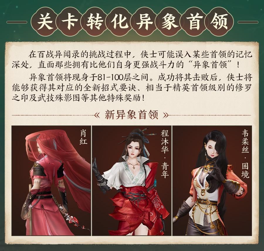 侠士在探索在81-100层时,将有机缘误入某些首领记忆深处,直面比其本身更加强大的“异象首领”,成功将其击败将获得更为丰厚的特殊奖励!