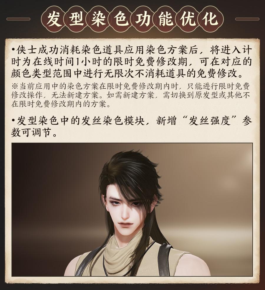 打造你的最佳发色,发型染色功能优化上线!侠士成功消耗染色道具应用染色方案后,可在一定时间内进行无限次的免费修改,搭配更随心!