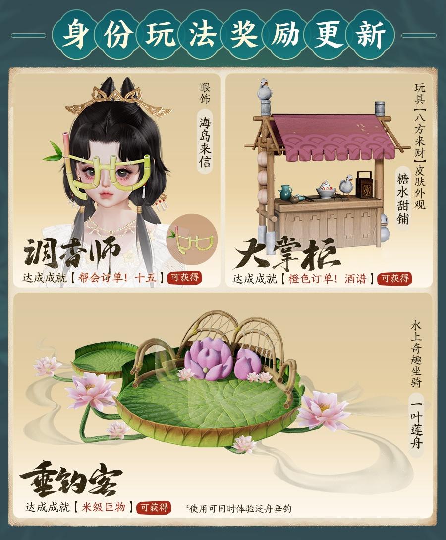 侠士通过家园身份玩法达成对应成就,还可获得全新奖励!水上奇趣坐骑【一叶莲舟】翠叶载身凌波而行,露凝莲香;眼饰【海岛来信】俏皮可爱,满怀意趣!甜蜜蜜的不只有甜品主题武器,大掌柜的居家家具【糖水甜铺】也不容错过!