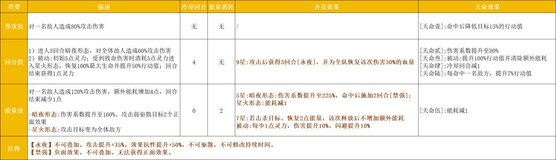 2)回合技:释放后进入3回合暗夜形态,造成群体伤害,获得3回合永夜,为全队回血,能自拉条,命中目标越多拉条越多;初始拥有5点灵力,受到致命伤害时会消耗5点灵力进入星火形态,并恢复100%最大生命、提升自身100%行动值和清除额外能耗,自身回合结束获得1点灵力