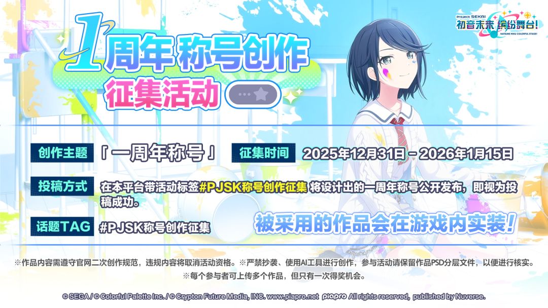 关注官方账号,并带活动TAG#PJSK称号创作征集 将设计出的一周年称号公开发布于本平台,即视为投稿成功。