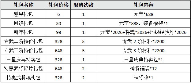 1月开始原战令薄的中神将碎片福袋(单)以及神将魂福袋(单)替换为神将碎片自选(单)总数量保持不变