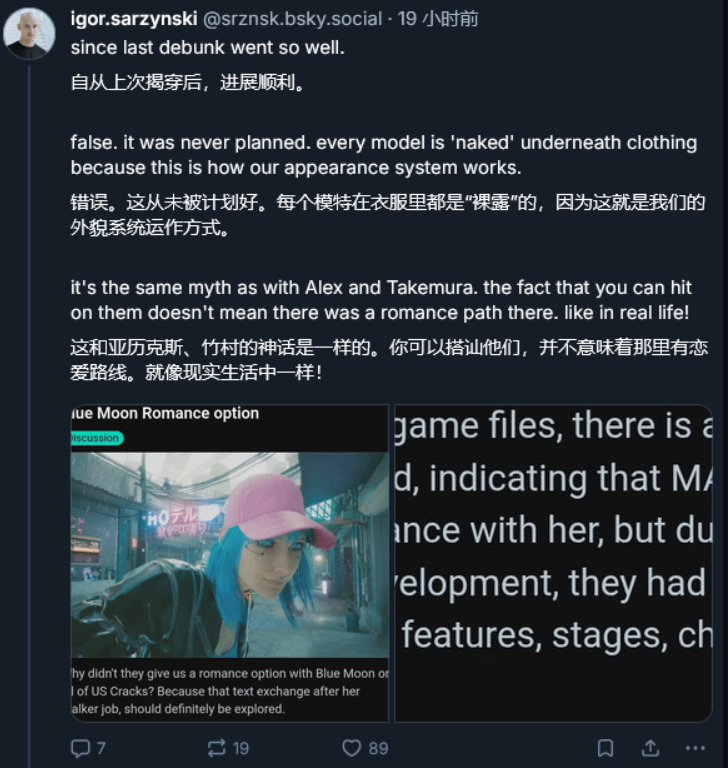 对此Igor Sarzynski直言传闻不实,他解释所有NPC建模默认“裸露”是游戏运行底层逻辑,并非恋爱线专属设定。他补充,玩家虽能和蓝月搭讪调情,但就像现实生活一样,这类互动不代表存在专属恋爱路线。不过他也坦言,CDPR在游戏发售后确实讨论过为蓝月新增恋爱剧情,只是最终为优先推进DLC “往日之影” 的开发,选择放弃这一计划。