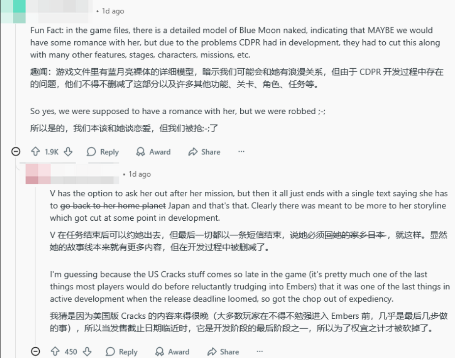 蓝月是游戏中人气颇高的NPC,支线任务里她因被狂热粉丝跟踪向主角V求助,姣好面容搭配活泼性格,再加上后续暖心短信留言,给不少玩家留下深刻印象。近期该传闻在Reddit社区再度发酵,引发大量讨论,有玩家以蓝月存在裸体模型为依据,推测她原本设计有专属恋爱剧情,最终因开发调整被删减。