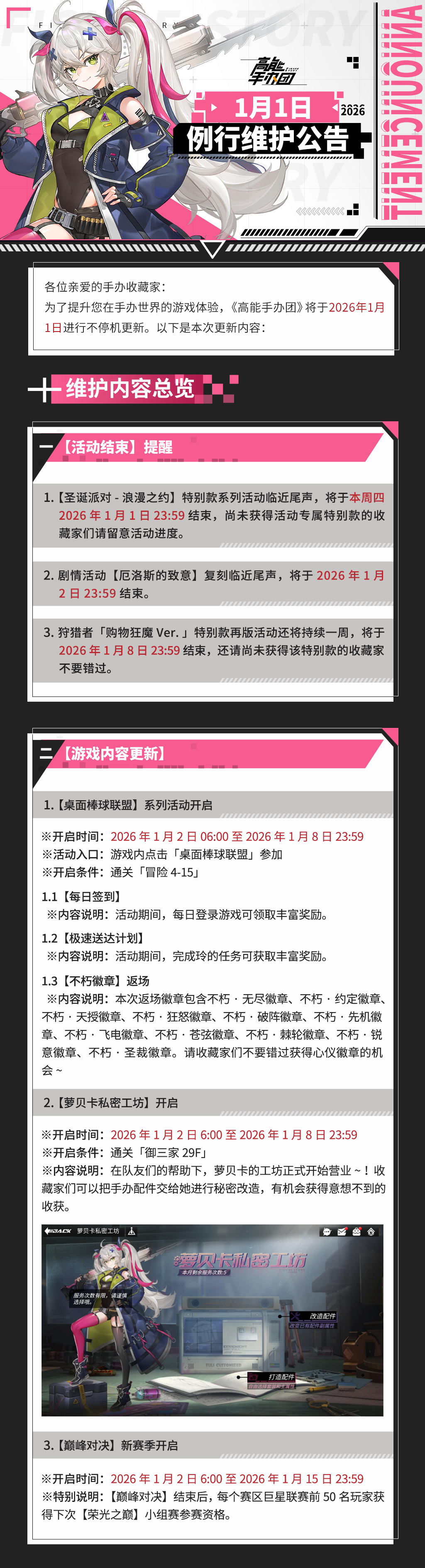 各位亲爱的手办收藏家:为了提升您在手办世界中的游戏体验,《高能手办团》将于2026年1月1日进行例行维护。详细公告内容请点击下方图片查看: