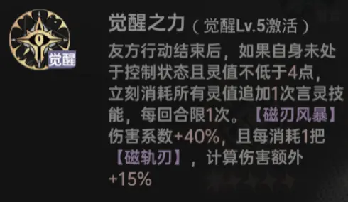 最后则是苏茜极为重要的觉五,友方行动结束后,如若自身未处于控制状态并且灵值足够的话,能直接追加一次言灵技能,这完美地和苏茜给予队友回合地机制进行了结合,在自身完全不需要动的情况下开出大招并续上buff。而后半段更是夸张,【磁刃风暴】的伤害系数提升为100%攻击的物理伤害,并且每消耗一把【磁轨刃】,计算伤害额外+15%。苏茜是月绘之后第一位拥有计算伤害的角色,这似乎标示着计算伤害或许会逐渐泛滥,月绘可能会走下神坛。