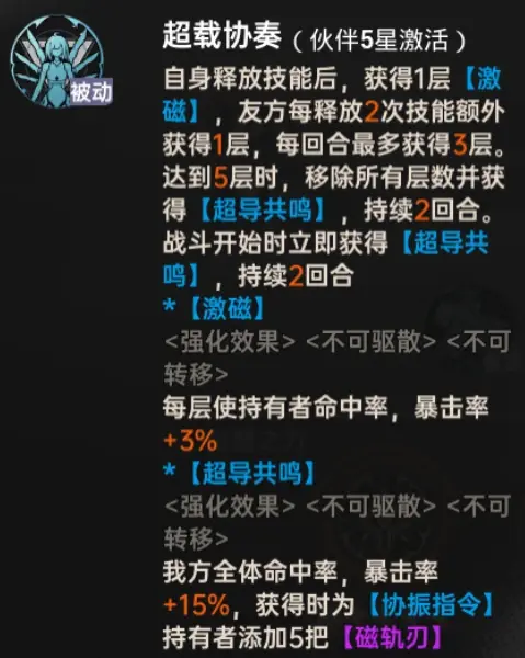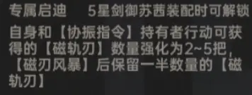 从这里我们知道,五星苏茜拥有一身的开局启动,包括为队友添加回合的【协振指令】、获得磁轨刃的【超导共鸣】、消耗磁轨刃触发的【磁刃风暴】。所以苏茜几乎和月绘一样,拥有许许多多产生质变可以携带的星级。