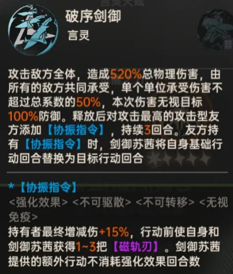 其次他的释放效果还有给攻击最高的c位添加【协振指令】,在队友获得加成的同时,让他行动前给自己和苏茜获得随机数量的【磁轨刀】,同时苏茜将自身的回合换给主c,持续3回合,并且【协振指令】是拥有无视免疫的超级强化效果。那么从这里我们就知道两点:一是苏茜无法单c,必须配备一个攻击型角色;二是如果添加上了这个buff,那么主c直接在三回合内行动6次,这是一个超级暴击的效果,因为行动不同于多动,它可以回灵并且触发某些额外效果,所以说苏茜的角色适配度远高于巫女诺诺。