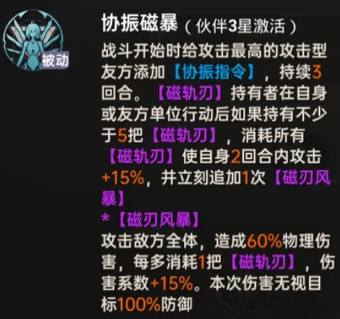 而除了开局启动,苏茜最后一个核心机制【磁刃风暴】也是在这里出现,【磁轨刀】的持有者在自身或者友方行动后,若持有不少于5把【磁轨刀】,那么就会消耗【磁轨刀】追加一次【磁刃风暴】。