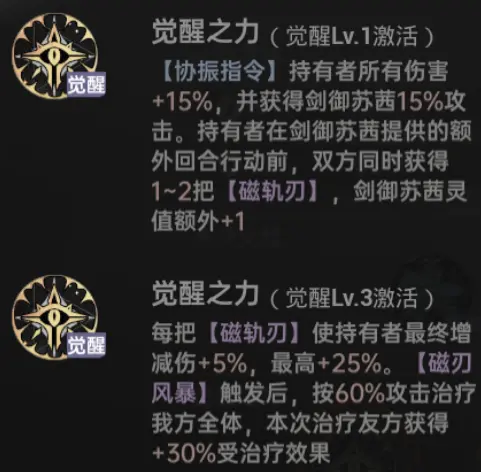 苏茜的觉三也是一个拐,但数值也是极其暴力,25%的最终增减伤很容易叠满,后半段则是触发【磁刃风暴】时能为友方进行治疗,很好地弥补了目前顶配队里没有奶妈的现状。