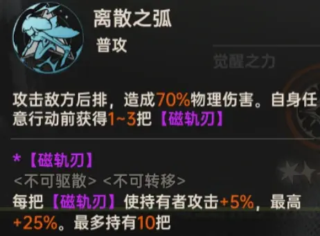 苏茜的普攻是和龙路月绘同款的较为罕见的领域效果,即无法被克制。任意行动前获得【磁轨刀】,使自身攻击力增长,五把叠满,而最多获得十把,那么后续的技能也大概率是围绕【磁轨刀】展开设计。