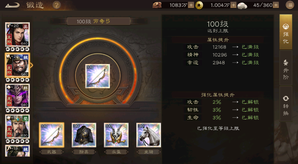 装备强化系统可以获得大量的属性加成,彩色及以下装备都可以强化到90级,彩色一阶装备可以额外增加10级强化,强化到100级。