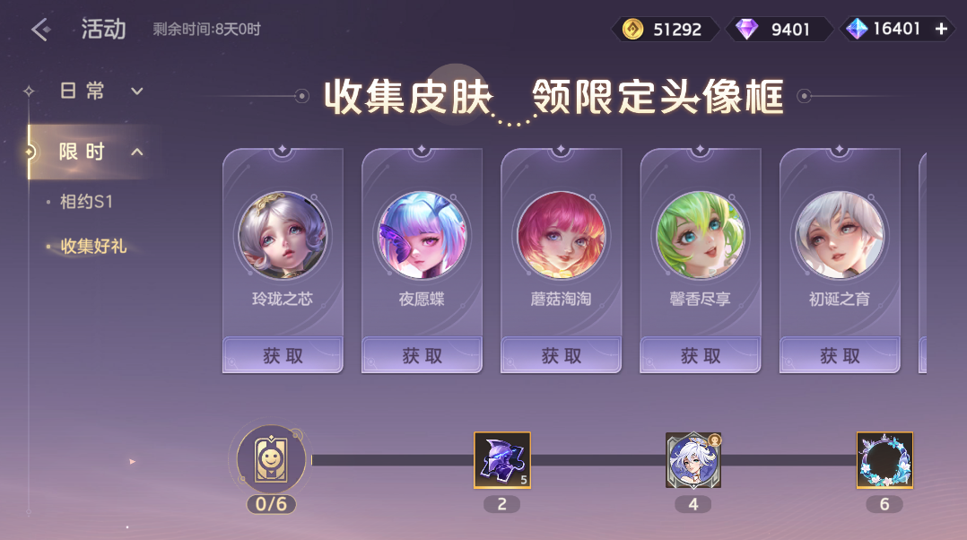 收集艾璐妮系列皮肤,根据收集进度可获得新品限定动态头像框花间游、新品限定动态头像云端龙姬、皮肤碎片。