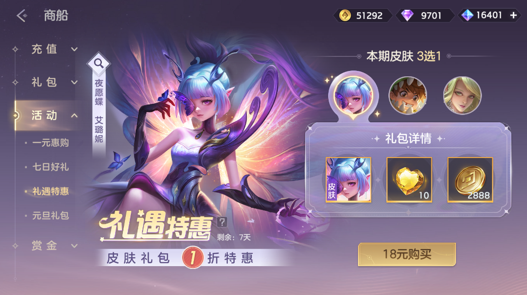 礼遇皮肤礼包限时1折,艾璐妮·夜愿蝶、鳗鳗·玩具大亨、西施·人偶新娘超值3选1。