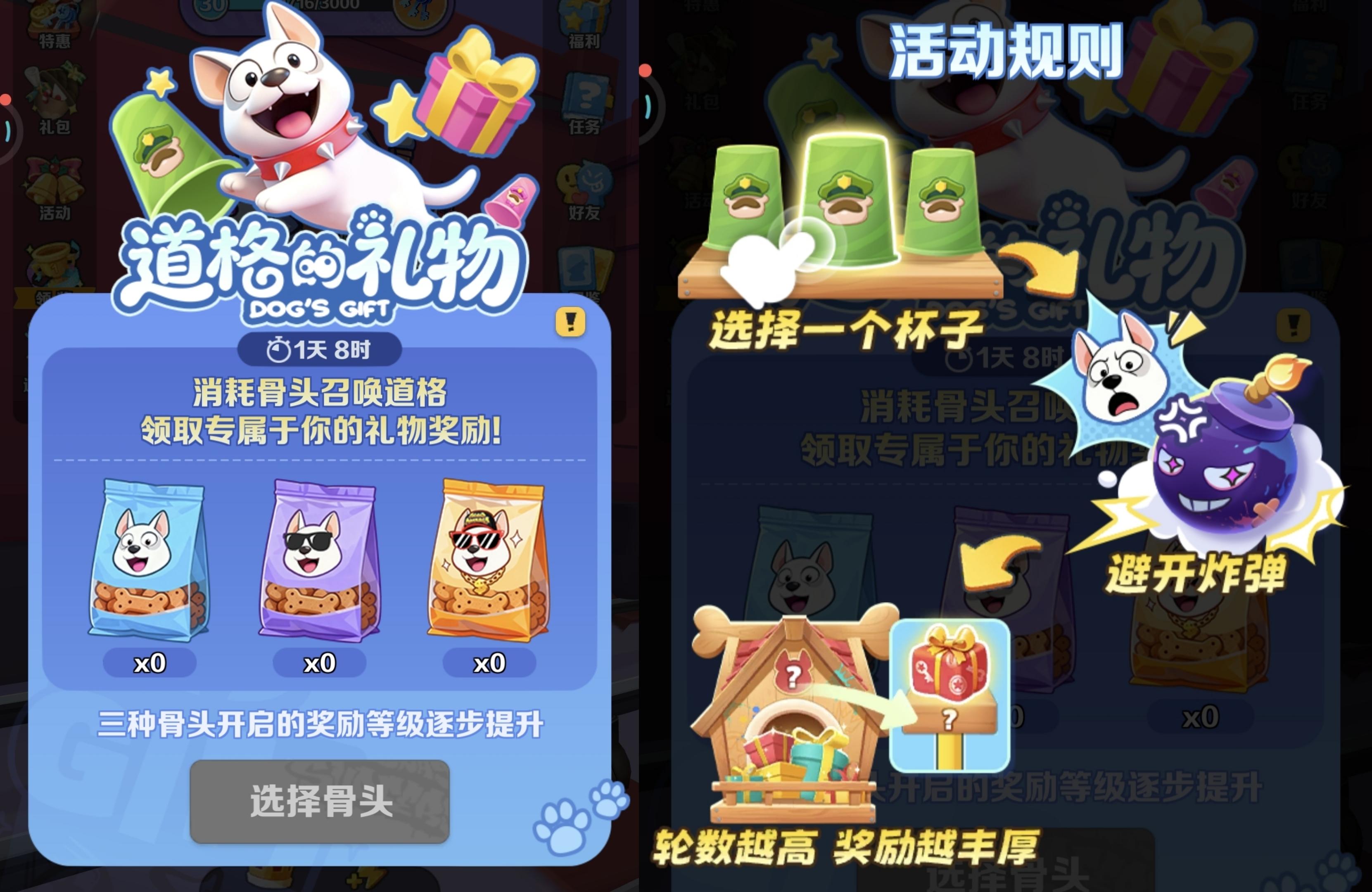 如图所示,投喂给狗狗不同的狗粮会有不同奖励,且逐步递升,普通狗粮官方会通过邮件发放,而高级和金冠狗粮则需要花钱购买礼包。活动规则是不要选到有炸弹的杯子,主要靠运气。