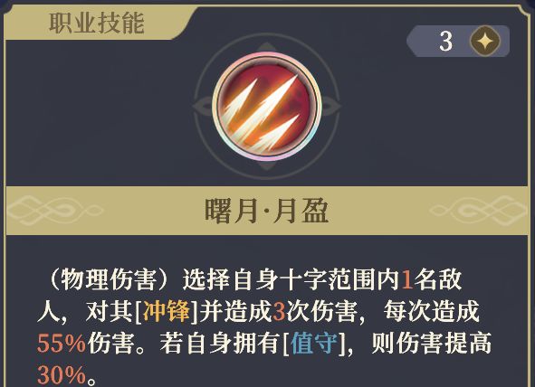 而爱莎的技能,可以分为两个流派,老寒建议玩输出流。大招带11阶左的盈月,这是个冲锋技,会被卡2格高差,同时,爱莎有值守时增伤30%。