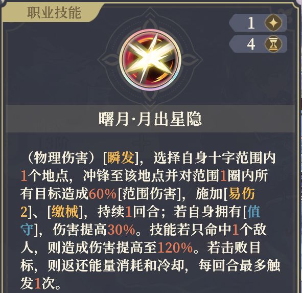 最后是3阶左的瞬发、控制型对群技月出星隐,单群兼备的技能,但对群倍率减半;能缴械敌人,上易伤2。缴械属于定身效果,敌人被缴械后会原地发呆。重要的是,月出星隐长达4CD,但击败敌人可以刷新技能,环境物、拒马、酒桶等这些都算能刷新CD。连人带物一起A,更容易刷新技能CD。