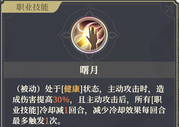 被动带7阶左的曙月,爱莎在健康状态下增伤30%,并减少技能1CD,减CD每回合1次。