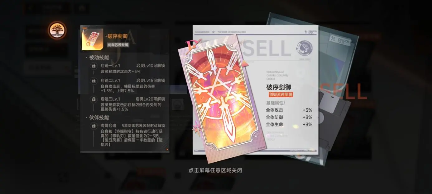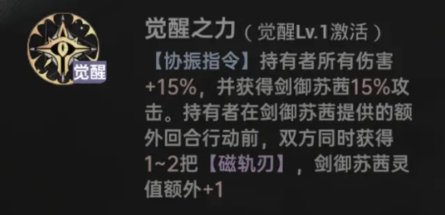觉醒1星:【协振指令】持有者所有伤害+15%,并获得苏茜15%攻击,持有者在苏茜提供额外回合行动之前,双方同时获得1-2把磁刃,保证磁刃对全局的续航,并且还有自身回灵+1,还不会受到月绘的影响。