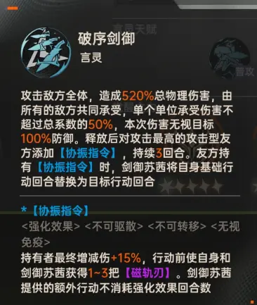 言灵【破序剑御】:无视目标100%防御,并给攻击力最高的攻击型队友添加【协振指令】,持续3回合,将自身的基础行动回合替换成目标行动回合,在【协振指令】加持下,苏茜把自己的行动回合替换成攻击力最高的队友,加快主C的启动回合,三回合内,己方攻击力最高的角色可以行动6次。并且苏茜提供的额外行动不消耗强化效果回合数,能够让主C身上的所附加buff完整覆盖这一个循环。
