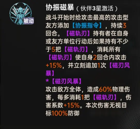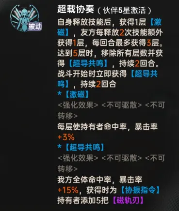 5星被动【超载协奏】:自身释放技能后,获得1层【激磁】,右方每次释放2次技能额外获得1层,每回合3层,5层时移除所有层数获得【超导共鸣】buff,我方全体命中率、暴击率+15%,获得时令【协振指令】持有者添加5把【磁轨刃】,整体下来5星即可半完全体,后续觉醒的1、3、5星都是逐步伤害以及机制提升。并且【超导共鸣】开局无条件持续2回合,让【磁刃风暴】的追加伤害更快启动。