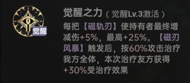 觉醒3星:每把【磁轨刃】使持有者最终增减伤+5%,最高+25%。【磁刃风暴】触发后的治疗全体,按照60%攻击计算,并+30%治疗效果。在进一步提高伤害的同时还可以转换治疗给队友,无疑是伤害续航两手均抓。