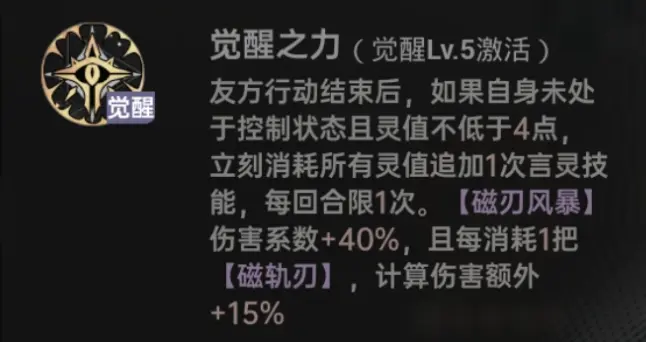 觉醒5星:友方行动结束后,自身未处于控制状态且灵值不低于4点,立即消耗所有灵值追加1次言灵技能,每回合1次。能够一直保持【协振指令】的持续循环。【磁刃风暴】伤害系数+40%,且每消耗1把磁刃,计算伤害额外+15%。伤害加成已经近乎完美,之后就是专属启灵的额外加成。