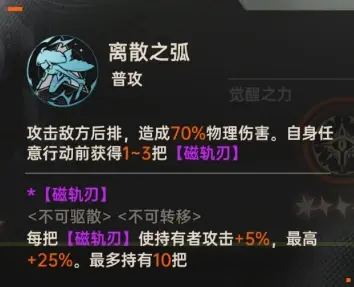 普攻【离散之弧】:是可以在行动之前附加【磁轨刃】,每把磁刃使持有者攻击+5%,最高25%,最多可以拥有10把。上限10把【磁轨刃】,也是为后续的一些围绕磁刃展开新机制做铺垫。