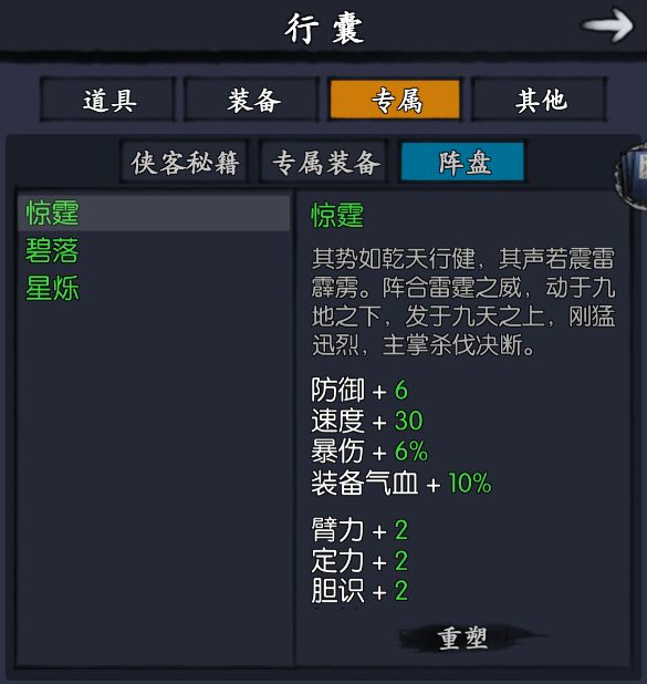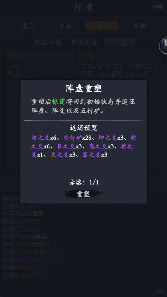 还有个要说的阵盘重塑,问号里并没有解释的很详细,重塑的话首先需要脱下该阵盘,然后才可进行重塑,重塑返还基本就是消耗的银两跟玉琥(阵盘突破材料)不返还别的都会返还,可以在重塑确认界面看到
