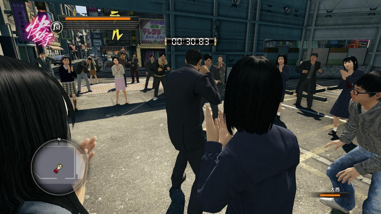 尽管作为一部老游戏,《如龙0》的热血动作演出没有近两年刚出的即时战斗如龙《无名之龙》和《夏威夷海盗》那么夸张华丽,但我可以明确地说,在近身肉搏的搓招打击感上,《如龙0》的战斗里,杂兵并不会轻飘飘地一拳砸下去就飞起来,这种更写实的打击感在我看来属于是加分项。不过说到战斗也不得不吐槽一嘴,神室町的居民还真是超雄啊。任务里一言不合就要打架,不打架不会好好说话,路上成群结队的游荡NPC也是动不动就主动讨打,而其他NPC则会自动围成一圈看着打架,拍手叫好。