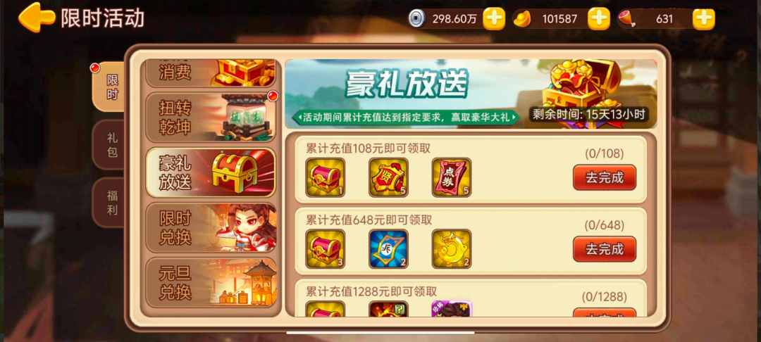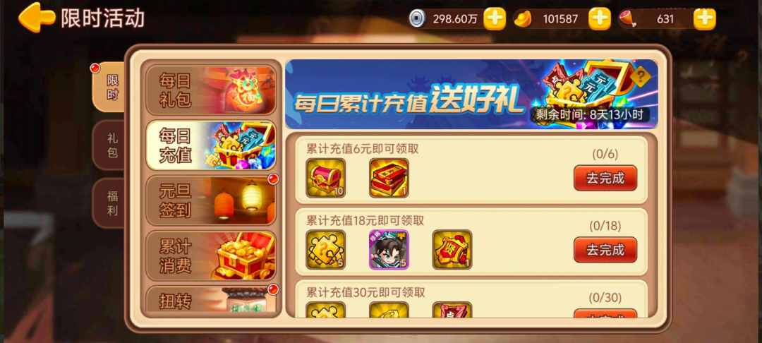 活动内容:活动期间每天累计充值至指定额度,即可领取奖励。次日0点刷新充值进度。