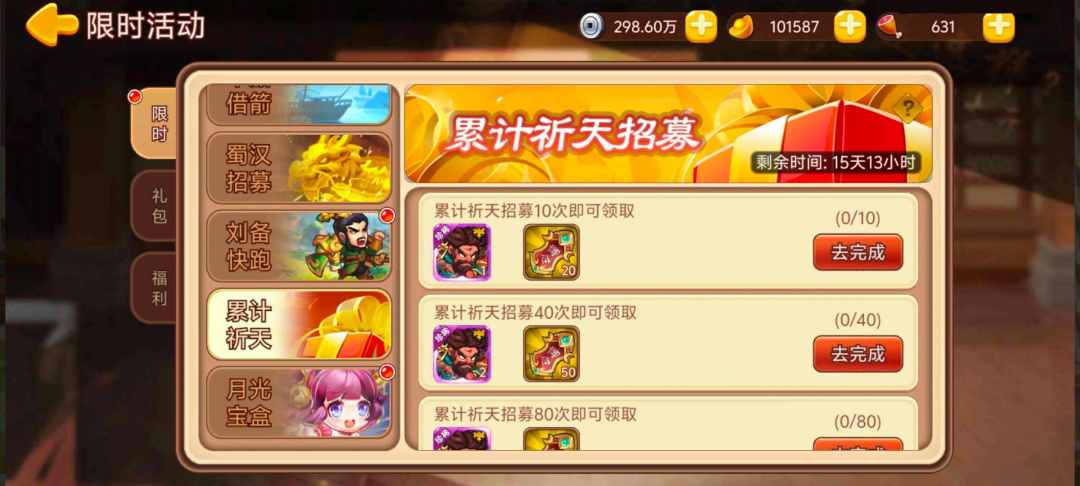 累计祈天200次:祁天御令*150,关羽·义绝碎片*3