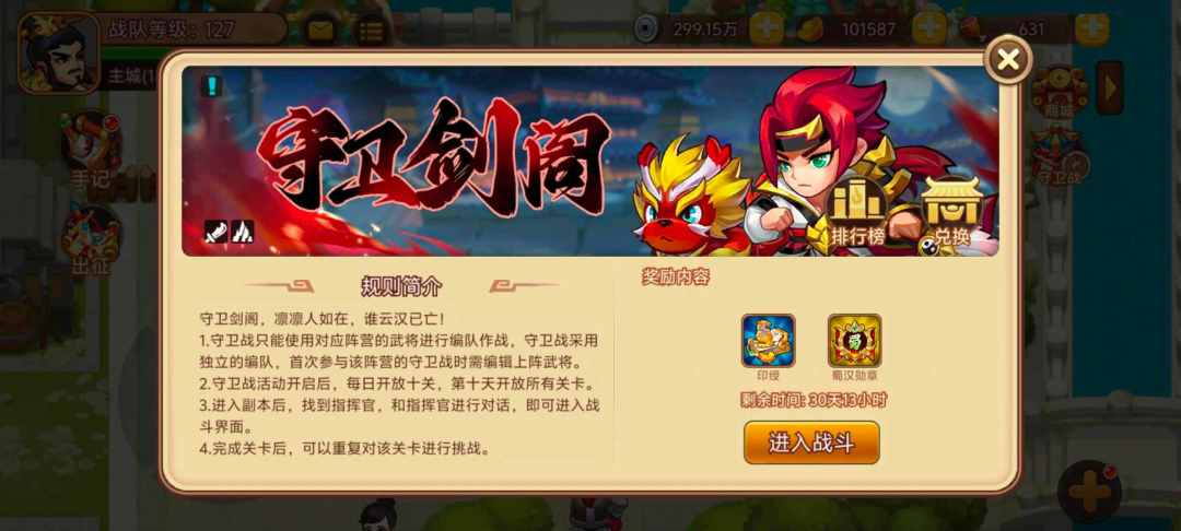 活动内容:活动期间开启蜀国守卫战,挑战关卡获得印绶和勋章兑换稀有奖励。