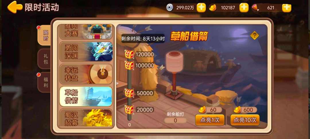 活动内容:为了在规定的时间内完成周瑜“十万支箭”的任务,帮助诸葛亮收集船灯,在弥漫雾气的夜色中向曹操“借箭”吧!