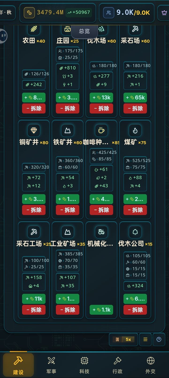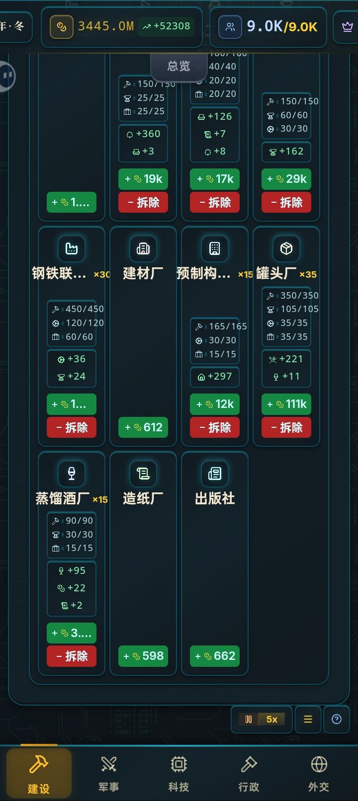 7.钢铁,可以建铸钢厂和钢铁联合企业,钢铁的主要消耗是预制构建厂和工厂,他们消耗不多,但是钢铁是工业时代后大部分建筑的升级材料,所以能扩建就扩建,价格的其实不重要,因为下游只有两家,工厂的产工具,没有铸铁工坊的生产比高,所以也不推荐大量的建工厂,所以他的目标是扩大产量,为你工业化做基础,价格倒是不在意,到后期玩的比较平稳的话,价格可以压下来,压到10块钱左右,比较好。