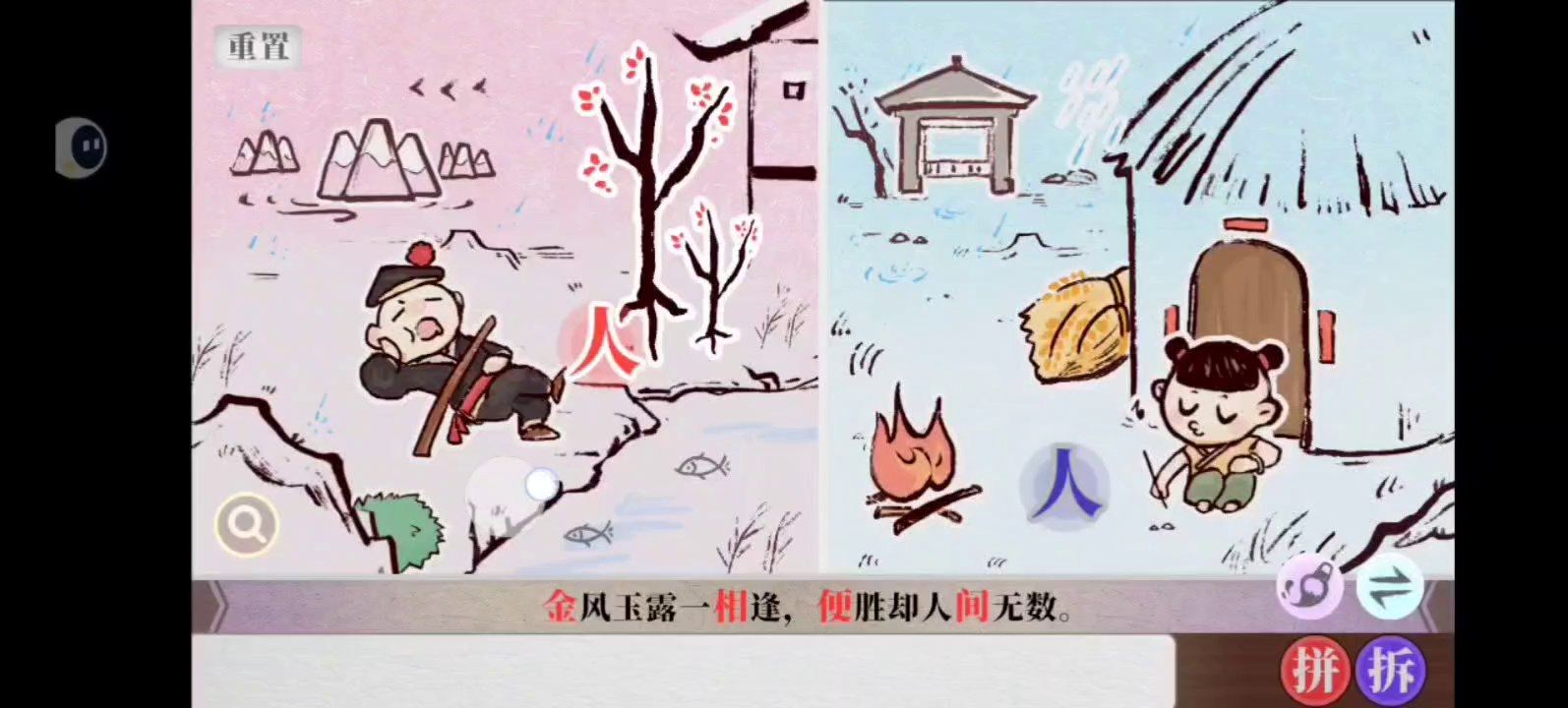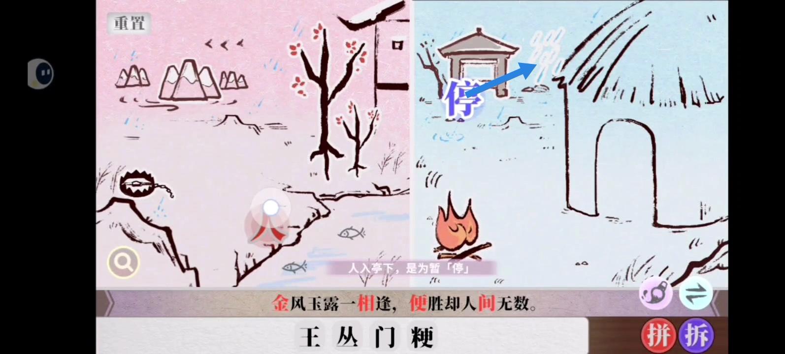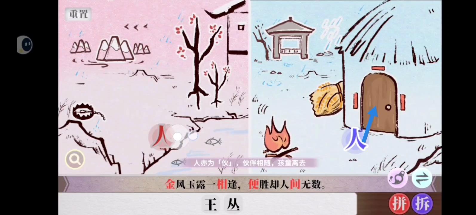 写这个帖子主要是帮助大家更好地找到字,通过关卡。以下按照可以找到的字和拆字、拼字的方法编排内容。其中红色的箭头和圆表示左边的人行动;蓝色的箭头和圆表示右边的人行动。