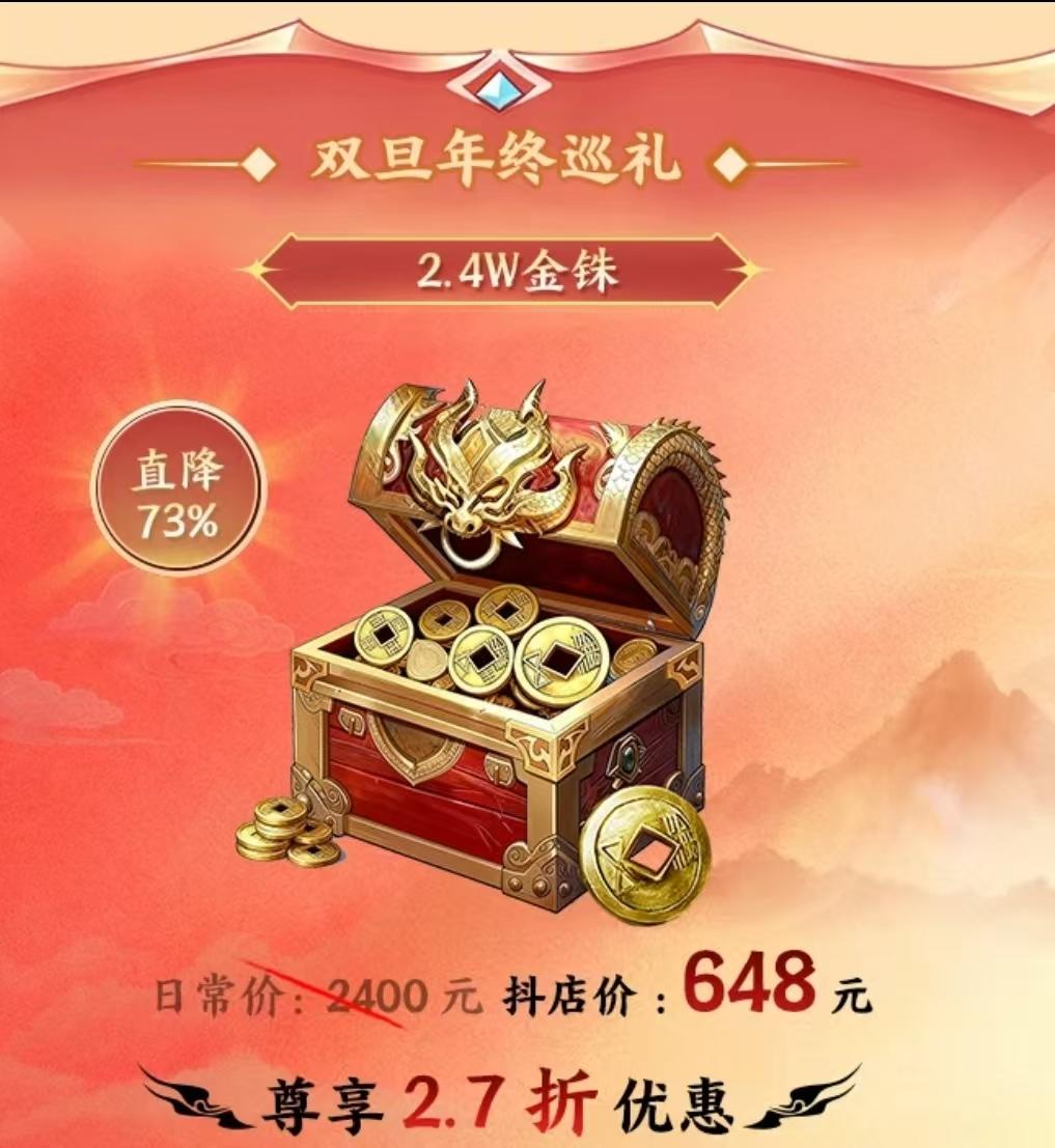 两个金币礼包,因为正好是西域活动,好多大佬都没有基金了,那就只能通过这两个礼包补一补了,比直接充金币还是便宜的。一个648能做一轮西域了,后面几层的话你能拿一个虎药、3星星符、四星星符、洗练石等资源了