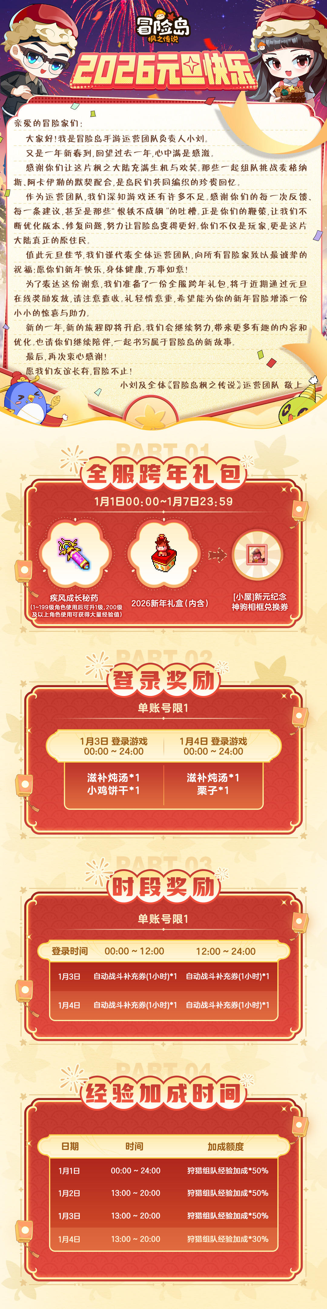 这个冬天,因你的冒险而温暖!值此元旦佳节,策划小刘和咩咩致冒险家们的问候暖心上线,还有1月1日-1月7日全服跨年礼包在游戏内登陆领取!