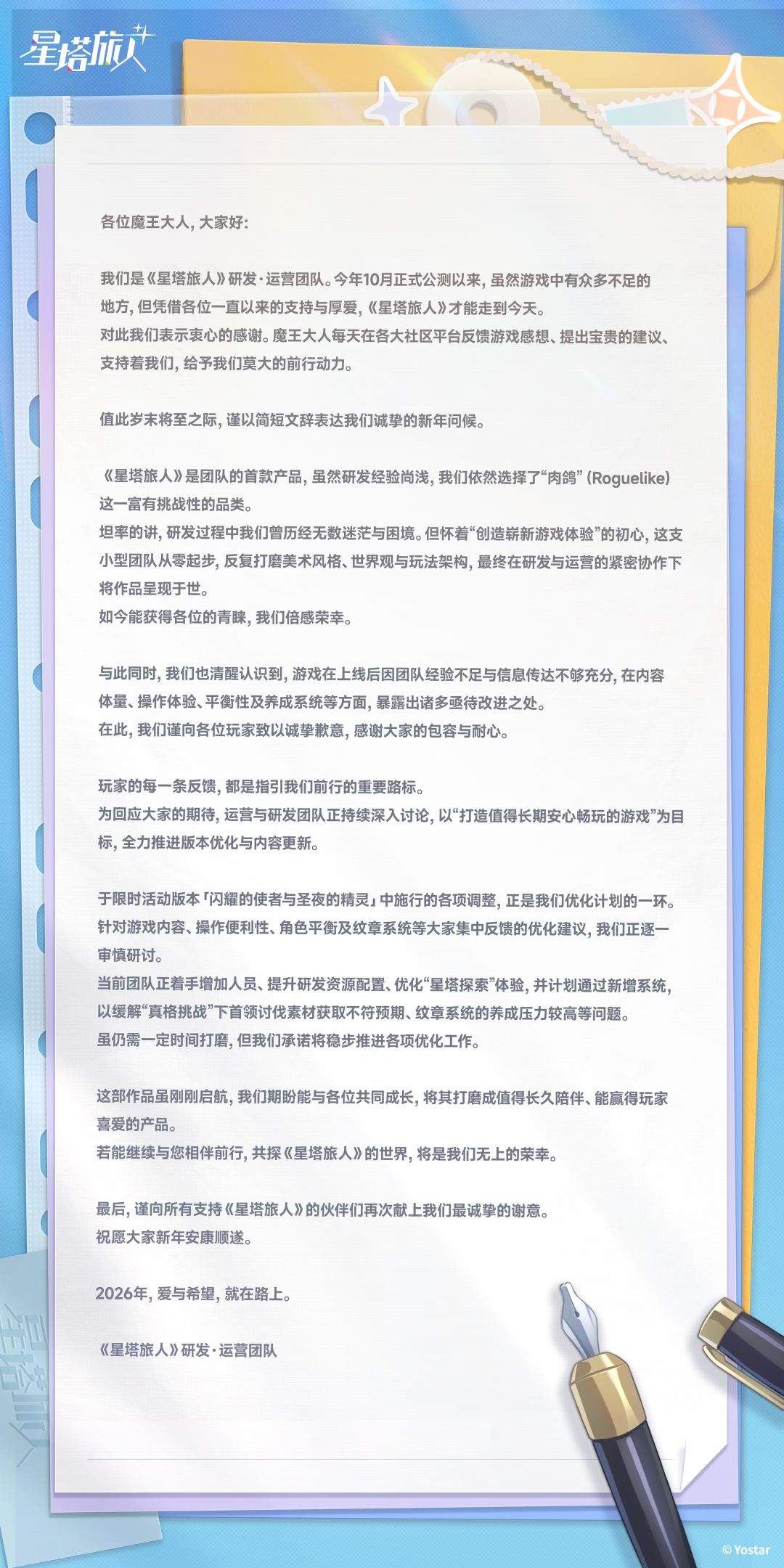新年的钟声即将敲响,在新年到来之际,我们准备了一封信以感谢魔王大人自公测以来对《星塔旅人》的支持与厚爱,您可点击图片以查看全文。