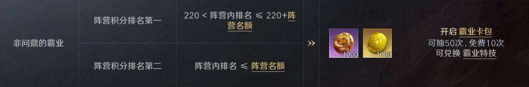 阵营积分排名第一,220<阵营内排名≤220+阵营名额,可以获得非问鼎的霸业奖励。
