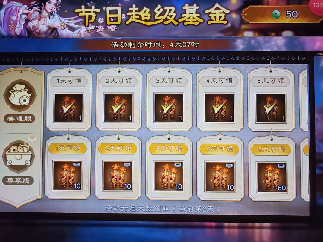 微氪:再氪个基金50RMB100个烟花。那么第二层有250烟花额度,建议优先兑换稀有神兽,200烟花,和一个极品神兵,50烟花。