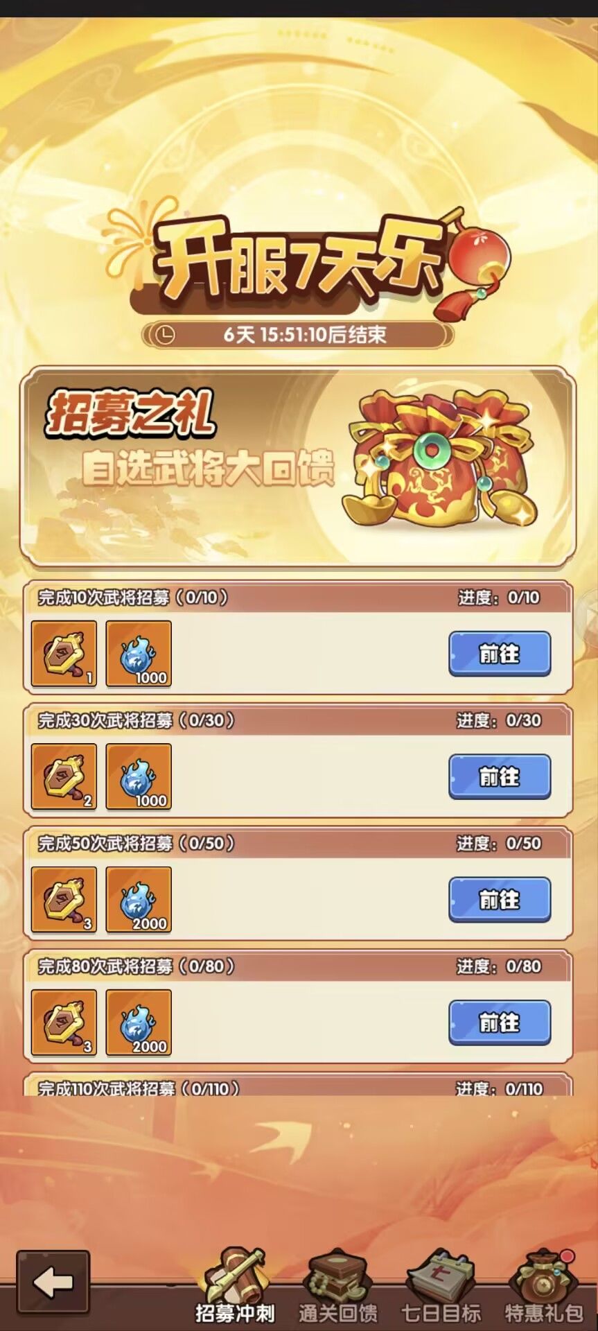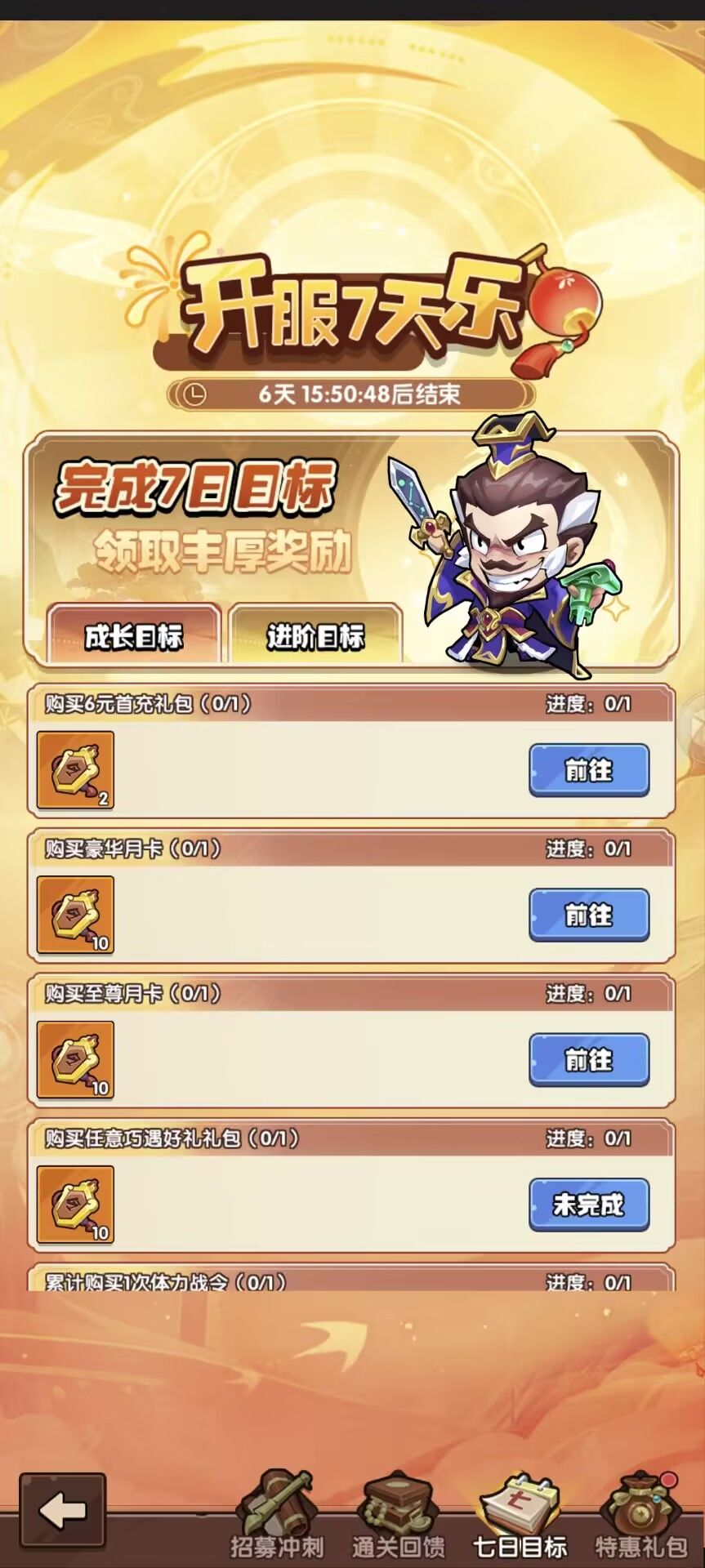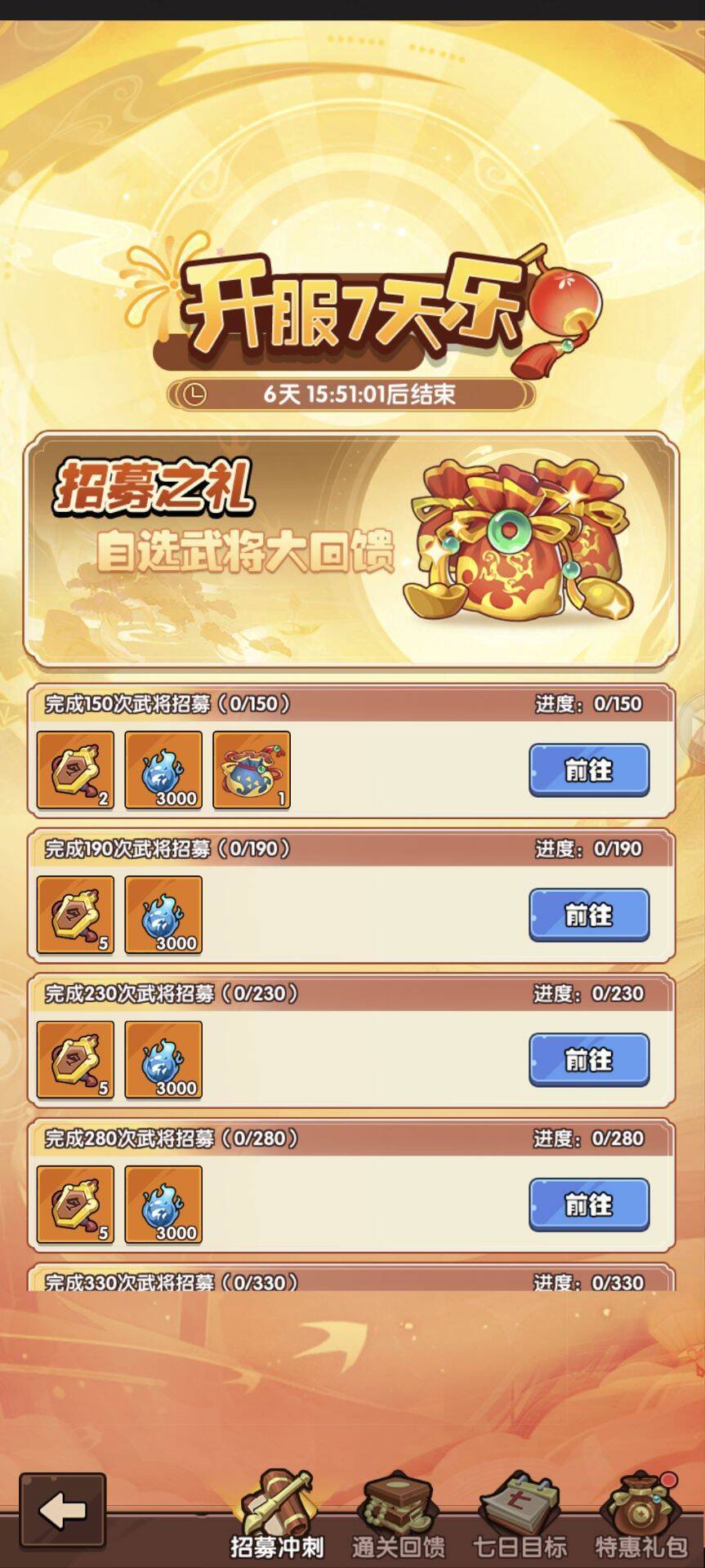 3-5天:武将幻境,第三天0点准时蹲守!武将越多,等级越高,羁绊越多,获得的积分越多,建议前面氪点6-18的活动礼包,把位置先开出来,越早开位置越占先机,这个活动奖励是非常丰富的。如果计划七天只抽330抽的,必须要留100抽做武将幻境任务,然后圣兽每天三次打满,其他的任务能做的都第一时间做完。