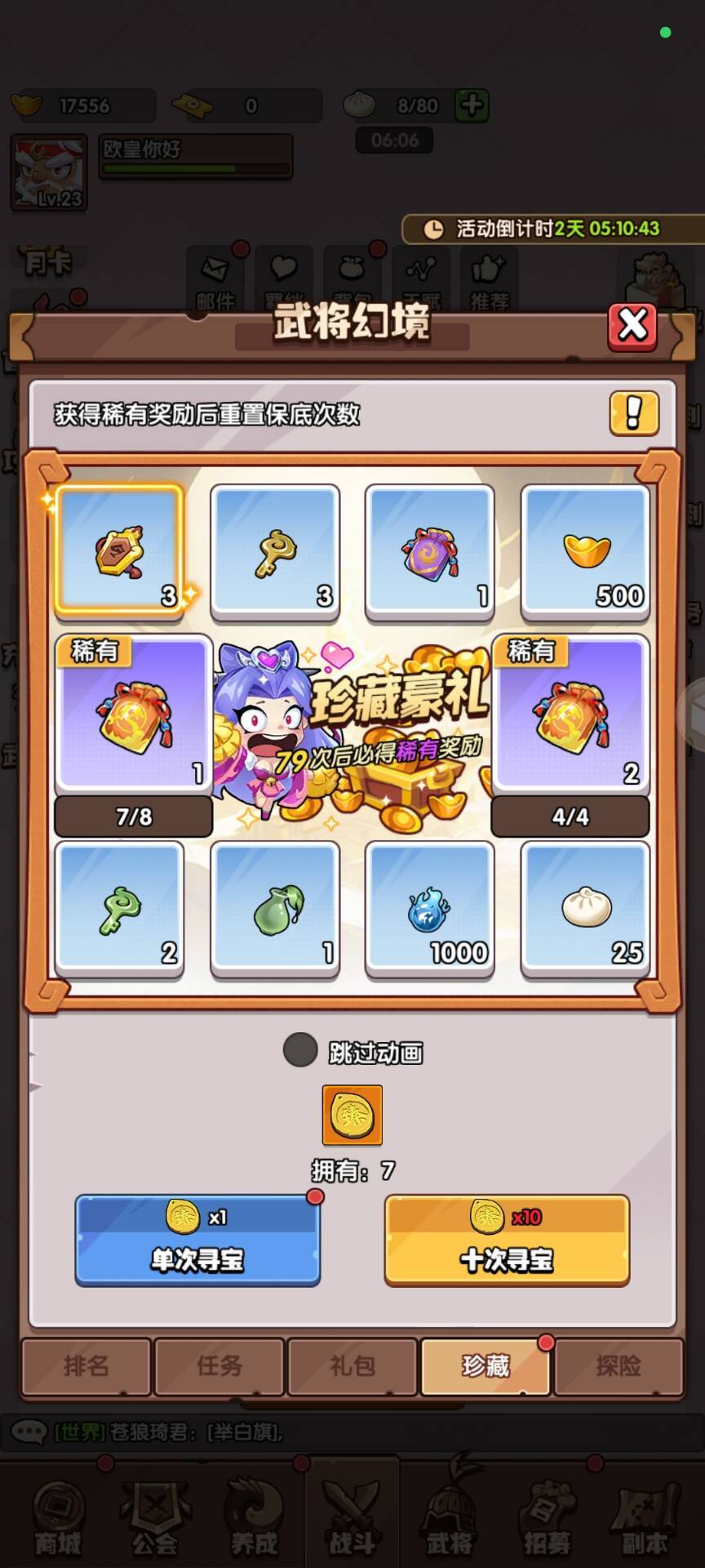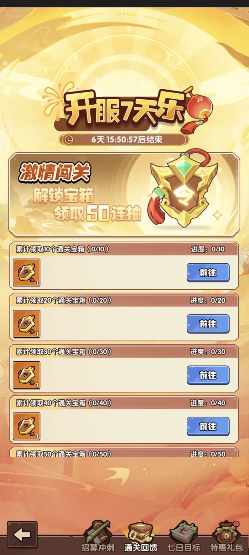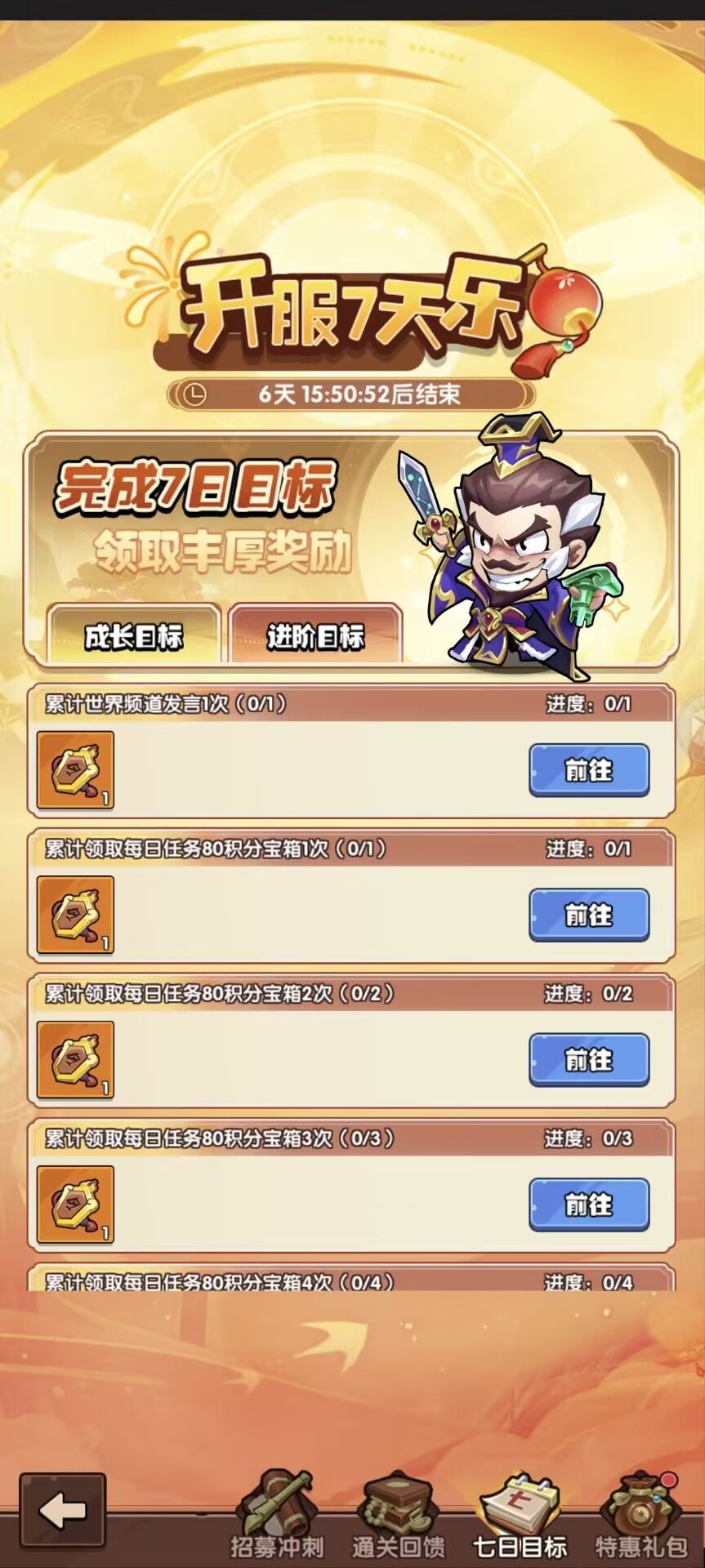 3-5天:武将幻境,第三天0点准时蹲守!武将越多,等级越高,羁绊越多,获得的积分越多,建议前面氪点6-18的活动礼包,把位置先开出来,越早开位置越占先机,这个活动奖励是非常丰富的。如果计划七天只抽330抽的,必须要留100抽做武将幻境任务,然后圣兽每天三次打满,其他的任务能做的都第一时间做完。