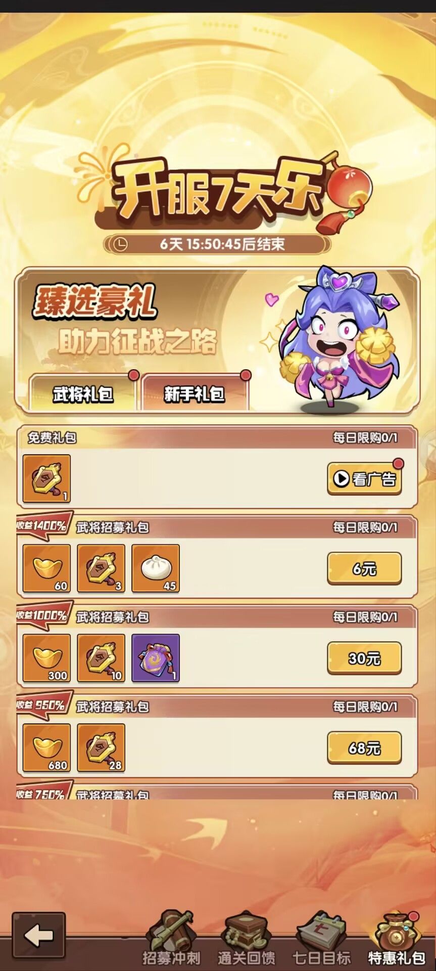 1-7天:七天乐,购买礼包,完成每日任务,使用招募令,通过关卡等任务可以获得相应奖励,推荐微小氪玩家前面抽330抽拿到自选传说武将锦囊(吕布三皇除外),尤其是三火差1个的这种,很实用。