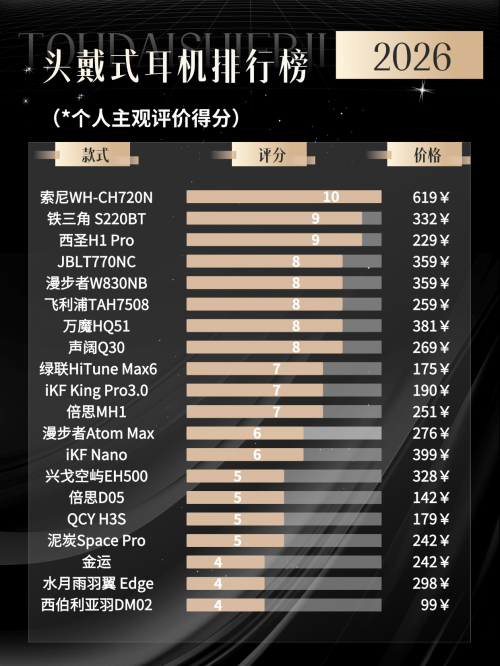 技巧 5:连得稳不稳,比你想的更重要很多耳机声音其实不差,但用着用着就烦,全是连接问题。动不动断一下、切个设备要重连、看视频有延迟,这些都会慢慢把人劝退。能安安稳稳连着、切设备顺、不折腾,用起来才是真的舒服。最后一句选头戴耳机,其实就是选一个能不能每天戴、会不会越用越烦。照着这 5 条去挑,大概率能避开花钱买不爽的坑。基于多次实测体验,我整理了2026百元价位头戴式耳机 10 强榜单,帮你避开这些坑,直接选到靠谱机型!