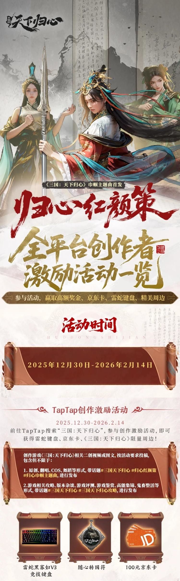 围绕《三国:天下归心》或《归心・红颜策》相关内容创作二创视频,带话题 #三国:天下归心 #按活动要求投稿,包含但不限于原创、翻唱、手书、舞蹈等形式。