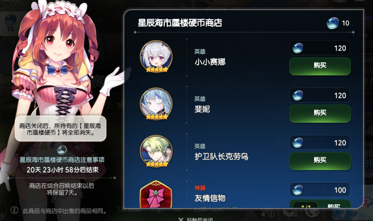 - 搜集「星辰海市蜃楼硬币」,在【星辰海市蜃楼硬币商店】中可购买在「自选组合召唤」中选择的英雄及神器,以及其他道具。