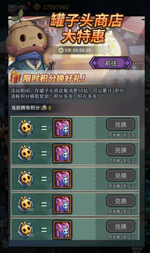 「活动介绍」活动期间在罐子头商店每满额度的钻石消费,可以累计积分,消耗积分可在罐子头大特惠商店兑换道具
