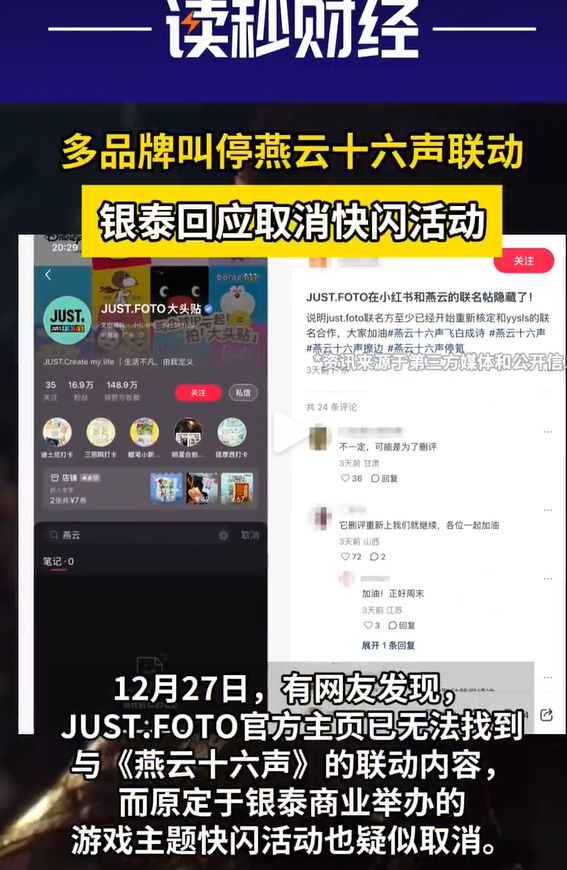 12月27日,有网友发现JUST.FOTO官方主页已无《燕云十六声》相关联动内容,原定于银泰商业落地的游戏主题快闪活动也疑似取消,此番变动恰逢《燕云十六声》因周年庆时装“飞白成诗”深陷争议,引发舆论持续关注。